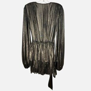 Bronx and Banco - Womens "Bellerose" mini dress, short length, long sleeve, lined, with deep V-neckline with snap closures at waist, shoulder pads, elastic waist, button cuffs, balloon sleeves, metallic shell construction, ruffled skirt, and self-tie belt, in a dark bronze metallic.