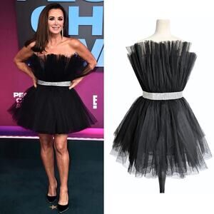 Keywords: Bronx and Banco Anna dress, red carpet dress, black tulle mini dress, strapless evening dress, Kyle Richards dress, designer event dress, size 10 XL formalwear, holiday party dress, celebrity style gown