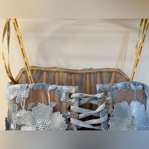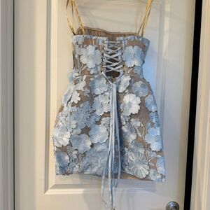 Elegant strapless mini dress. Features blue floral pattern. Perfect for special occasions.