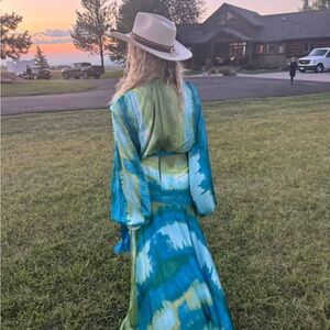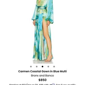Elegant maxi dress with a vibrant blue multi-color pattern. Features a stylish tie waist and flowing silhouette.