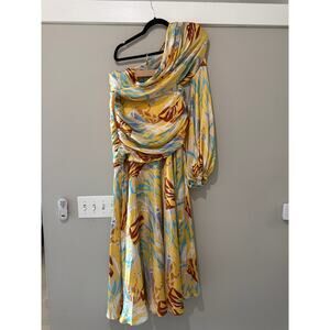 Bronx and Banco Jafari Isla Dress. Women's Size L / Large. Features one shoulder design, side cut out, side zipper closure, all over print, thigh high leg slit, long maxi length. 100% polyester. Great used condition, no notable flaws. Retail $950.