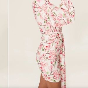 White and pink floral printed silk blend (60% Polyester, 40% Silk). Sheath. Long sleeve. One shoulder neckline. Back zipper with hook-and-eye closure. 33" from shoulder to hemline. Imported.