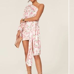A bold sash balances the voluminous one-shoulder that tops this playful and feminine floral mini dress by Bronx and Banco.