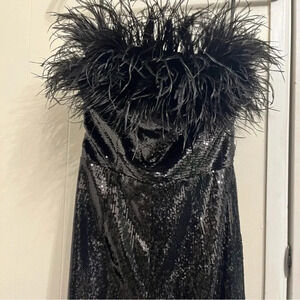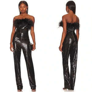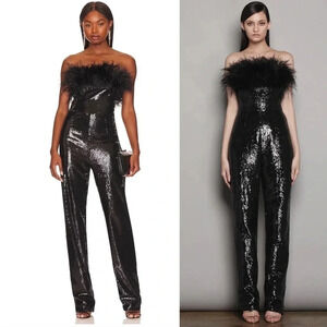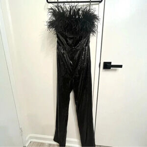 Bronx and Banco Lola black sequin jumpsuit. Strapless. Ostrich feathers. Zips up the back. New with tags. Size XS. Sold on revolve