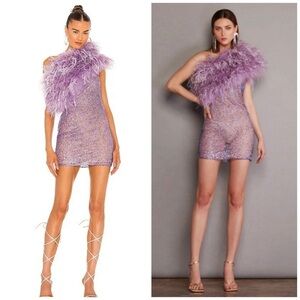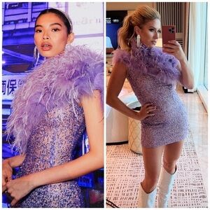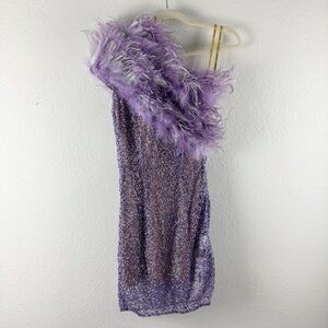 Bronx and Banco Lulu Sequin Glitter Feather One Shoulder Mini Dress Purple Small