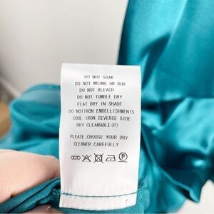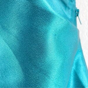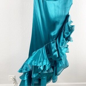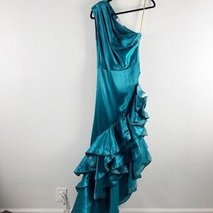 One shoulder, asymmetrical reinforced ruffle skirt, side zip closure, maxi length, fitted at the waist. Blue, turquoise. Silk, poly satin. Cocktail, party, event, night out, semi formal, wedding guest, date, evening, gala, black tie, bridesmaid.