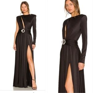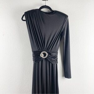 Padded one shoulder, maxi length, side slit, zip closure, unlined, front crystal ring detail, stretchy poly spandex blend material. Black. Cocktail, party, event, night out, semi formal, wedding guest, date, evening, gala, black tie, designer, glam, glamorous.