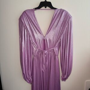 Size large (US 8). Excellent condition, no flaws. Waist cinching light purple color. Purple lame (95% Polyester, 5% Elastane). A-line. Long sleeves. V-neck. Tie closure. Left and right leg slit. Shoulder pads inside. Front and back clasp on v-neck. Revolve brand.