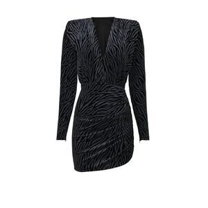 Wildly mesmerizing in zebra stripes, this Bronx and Banco velvet dress is styled with puffed shoulders and a ruched skirt for a chic '80s throwback.