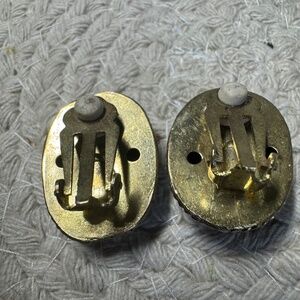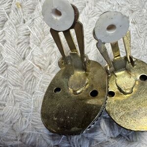 These bronze earrings have a script design and a rope like design around it. The bead in the middle is blue in the middle. Please note that one of the blue beads has a slight chip in the middle. Lot's of wear left in these clip on earrings!
