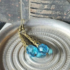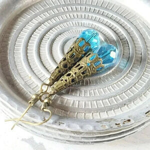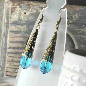 Bronze Faceted Crystal Turquoise Blue Antiqued Filigree Teardrop Earrings