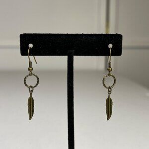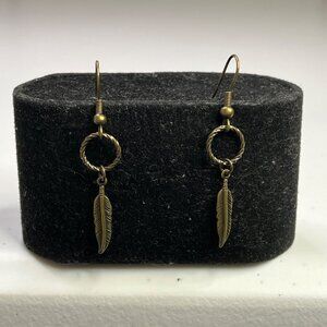 Bronze Feather Drop Earrings With Twisted Ring Design