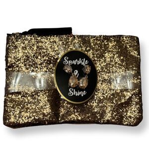 Perfect for the holiday season. This is a set of cosmetic bag and earrings in coordinating colors. The bag is in glittery bronze and the earrings are in a topaz color. The bag is 5.5” x 8”. The earrings are 1.5” long. Make this a gift or treat yourself. Who doesn’t want some glitters in their life?