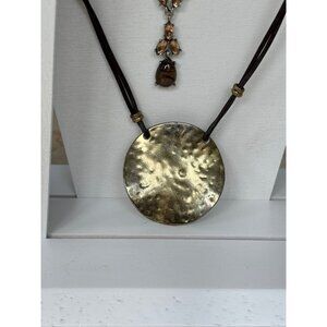 A curated set of eye-catching necklaces, featuring intricate bronze and gold designs, suitable for versatile styling and statement-making accessorizing.