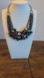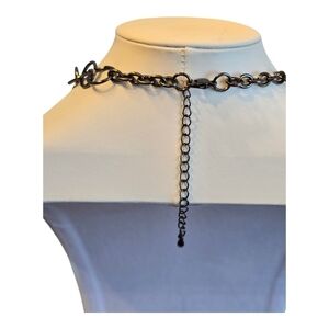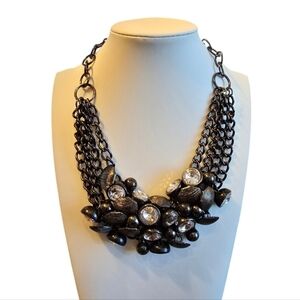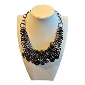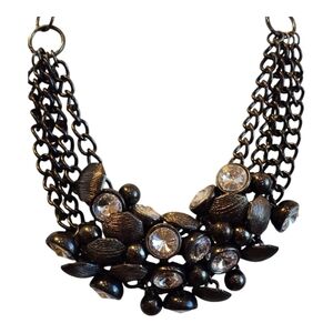 Like new bronze tone unbranded multistrand chain link bib necklace. Cluster of round bronze and clear rhinestone button shape beads in front. Lobster claw clasp. Excellent used condition.