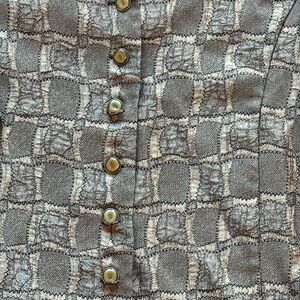 women's jacket with a subtle metallic pattern. Button-front closure for a refined look. Notched collar and long sleeves for classic styling. Lightweight fabric with a gentle sheen.