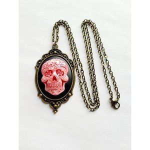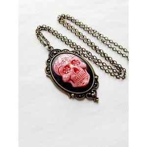 Bronze Red Metallic Sugar Skull Day of the Dead Gothic Rockabilly Cameo Necklace