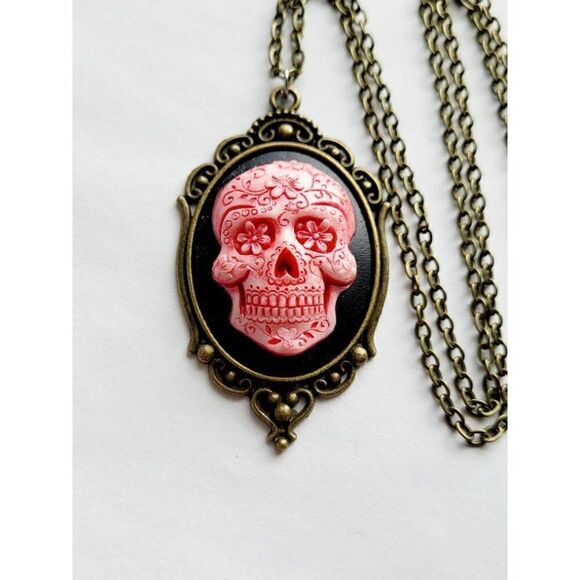 Bronze Red Metallic Sugar Skull Day of the Dead Gothic Rockabilly Cameo Necklace