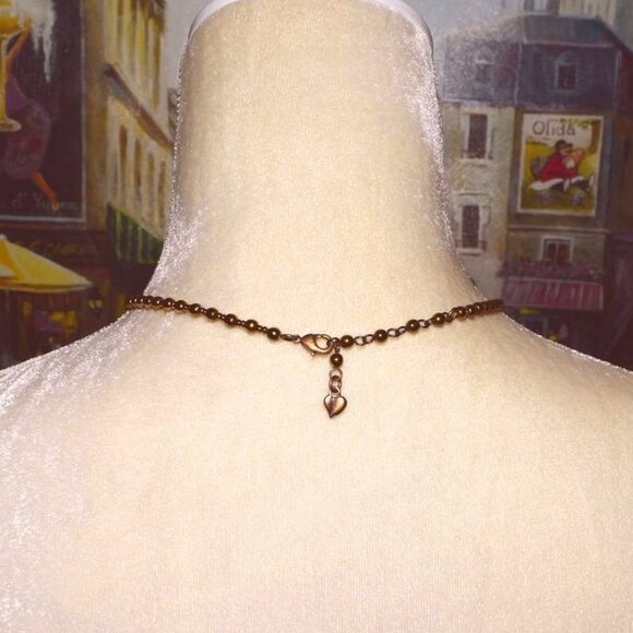 This estate collection necklace features a charming beaded style with a rhombus-shaped pendant in a dark gold to rich bronze color. It appears it may be artisan-made and possesses a vintage appeal. But it is engraved with a signature on a heart at the end of the extension.