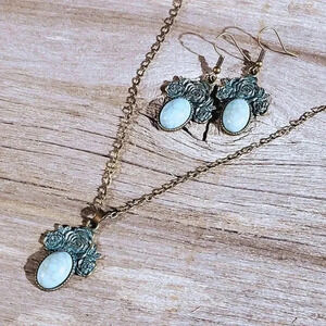 Bronze Rose Flowers Turquoise Blue Stone Chain Necklace Earrings Jewelry Set