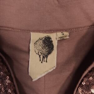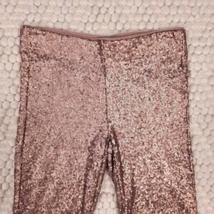 Shiny sequin pants in metallic bronze. Size small (S). These pull-on pants are fully lined on the inside in a soft cotton blend fabric, feature all-over mini sequins layered on a mesh fabric, and a flattering wide waistband.