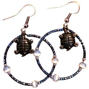 These silver and bronze hoop earrings feature charming turtle accents, perfect for adding a touch of whimsy to any outfit. The intricate design and cat eye bead accents make them sparkle in natural light.