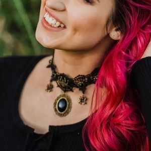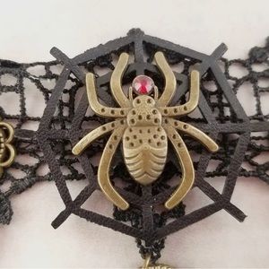 This handmade black lace spider choker features a large bronze spider perched on a web with two smaller spiders dangling daintily from the lace. Each spider is accented with red rhinestones.