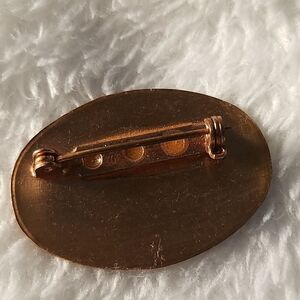 Bronze and white colored brooch. Size is 1.5 inches by 1 inches.