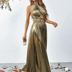 Bronze Women's Cross Wrap Front Backless Metallic Halter Wide Leg Jumpsuit