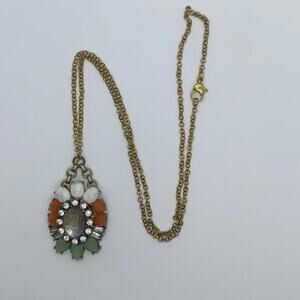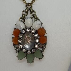 Bronze-tone hardware with multicolor pendants, clear rhinestones and a sparkly center stone. Lobster clasp closure.
