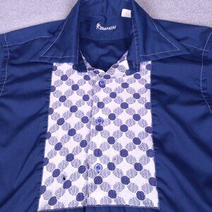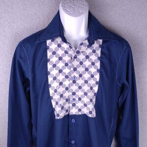 Vintage Bronzini navy dress shirt, featuring a bold white-and-blue geometric bib-front panel, contrast stitching, and button cuffs, pre-owned in good condition with a small hole in the bib area—overall clean, no stains, ready to wear.