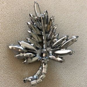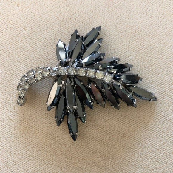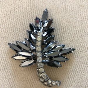 Brooch is Leaf design with marquise shaped dark gray stones and center stem is faux diamonds.