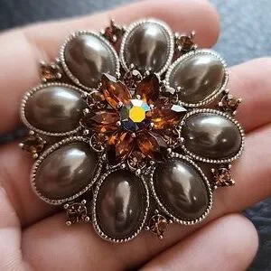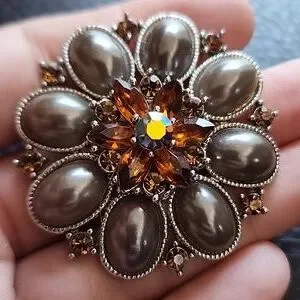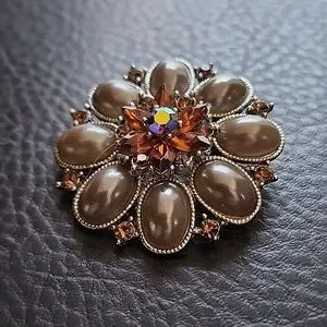 Pretty silver toned brooch with plastic beads and topaz colored crystals- approx 1.85" in diameter- normal wear- good condition O71