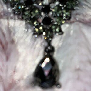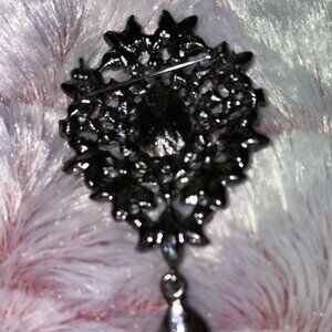 Modern brooch in gun metal gray and is 3 inches long and 2 inches wide. The stones appear to black but takes on a purple and green hue. No hallmarks.