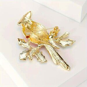 Red Cardinal Brooch Rhinestone Bird Enamel Pin Gold Branch Holiday Heaven Pretty Sparkle