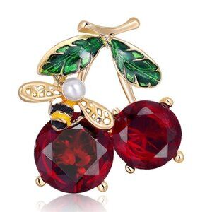1.25" Brooch Cherries with Bee Enamel & Red Rhinestone Gold Tone