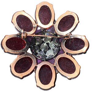 This exquisite 2.5 inches "Brooch Flower" is a vintage costume jewelry piece in a stunning purple color. Crafted with a bronze finish, it adds a touch of classic elegance. No Maker’s Mark brand ensures quality and longevity. Ideal for women who appreciate vintage style.
