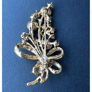 Brooch Pin 2.25" Flower Bouquet Ribbon Aurora Borealis Clear Black Rhinestones