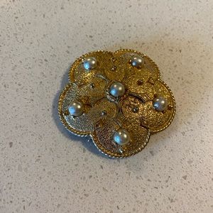 Brooch in gold tone with pearls shaped like a poppy. Can be worn as a necklace also. Very pretty 2 1/2” in diameter. Unknown brand. Non smoker no pets. Mailed thru the USPS