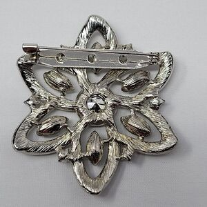 Dazzling clear rhinestone silver tone flower brooch, inspired by the retro 60's. It's a standout piece that adds vintage charm to any outfit. Perfect for ladies who love a touch of nostalgia.