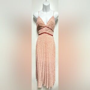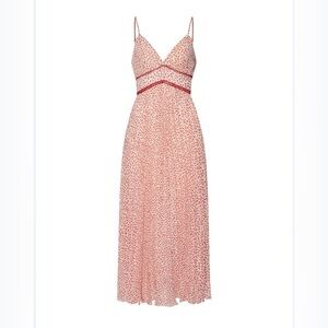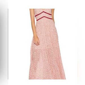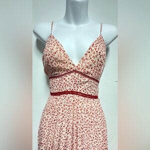 Chic maxi dress with spaghetti straps. White base with red accents. Perfect for elegant outings.