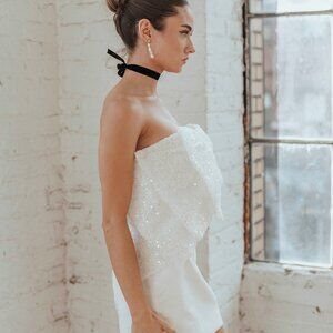 Make a statement at your bridal after-party, bachelorette, or any special event with the ultra-glamorous Brooklyn Bow Mini Dress! This stunning strapless mini features a dramatic oversized beaded sequin bow, adding the perfect touch of bold elegance.