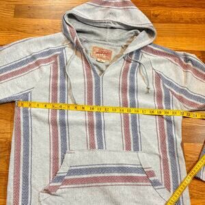 Brooklyn Cloth Baja Women’s XL Gray Red Blue Striped Pullover Hoodie Sweatshirt. Fully lined. Kangaroo pocket. Some stretch to the material. In good used condition.
