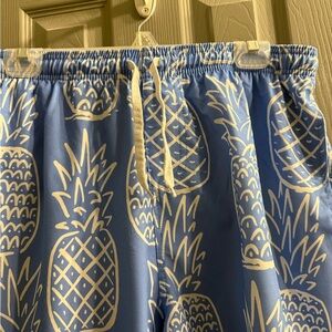 Brooklyn Cloth Mens Swim Trunks with elastic waist with drawstring, front side pockets & back pocket with Velcro closure. Blue & white with pineapples. Lining inside has been cut into at crotch area. Pic enclosed. They are still wearable. Good condition besides lining cut. Size Large. 90% poly 10% spandex. Machine Wash cold. Waist 36 stretched out 32 not stretched. Rise 13 inseam 6.5 length 18 SFPF HOME