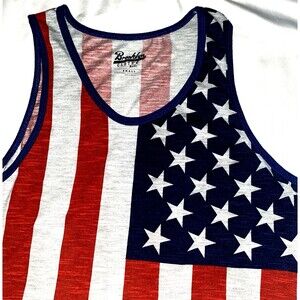 The Brooklyn Cloth Mfg Co. Men Tank Top in size small is a stylish and breathable garment perfect for the warmer months. Made from a comfortable cotton blend material, this sleeveless tank features a patriotic Americana pattern with stars and stripes, making it a great choice for a casual day or evening out. The design includes a scoop neckline and regular fit, with a lightweight knit fabric that is machine washable for easy care. Ideal for summer, fall, and spring, this tank also boasts contrasting trim, a tagless design, and a curved hem for added comfort and style.