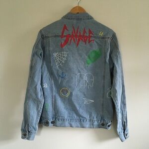 Brooklyn Cloth Savage Denim Jacket. Looking for a denim jacket to wear out when you hit the urban streets with the crew? Layer your favorite street wear outfit with this graffiti denim jacket. Details include graffiti screen print doodles allover, full metal button front, two side pockets, sits at the waist and modern fit. Long sleeve. Pointed collar. 90% cotton/ 10% polyester. Machine wash. Imported.