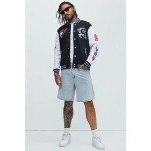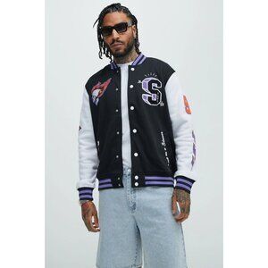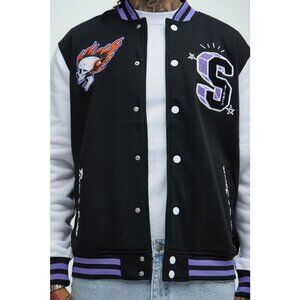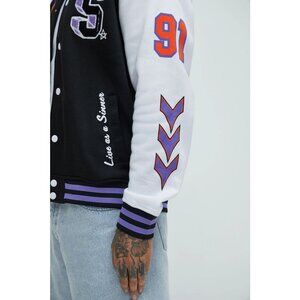 Elevate your street style with the Brooklyn Cloth Sinner Skull Bomber Jacket. This edgy piece features a striking black and purple color scheme, adorned with a bold skull and flames design that adds a rebellious touch to any outfit. Made with high-quality materials, this jacket is both stylish and comfortable, making it a must-have for those who want to stand out from the crowd.