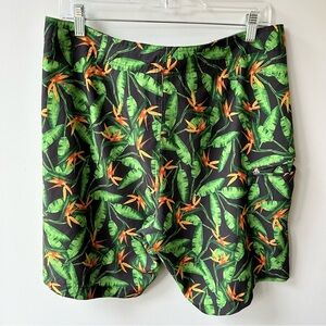 Features tropical bird of paradise allover print, drawstring and Velcro fly closure, left side zip pocket with a little corrosion on the zipper as shown in photo but still functional.