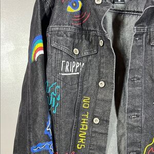 Stylish black jean jacket with vibrant patches. Features unique designs and bold colors. Perfect for a trendy look.