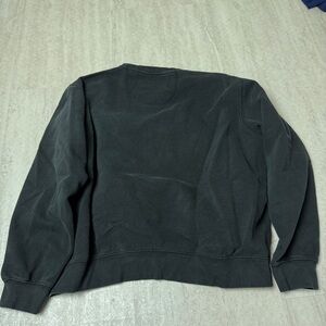 This stylish black crewneck sweatshirt showcases a distinctive white text graphic, arranged in a contemporary pattern.